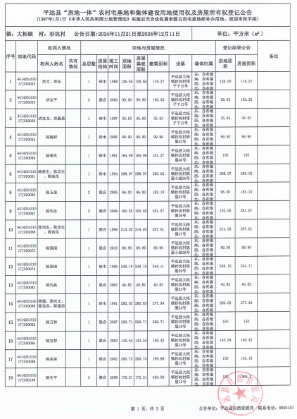 “房地一体”农村宅基地和集体建设用地使用权及房屋所有权登记公告(大柘镇杉坑村)