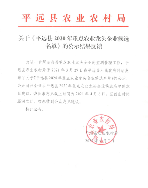 关于《平远县2020年重点农业龙头企业候选名单》的公示结果反馈