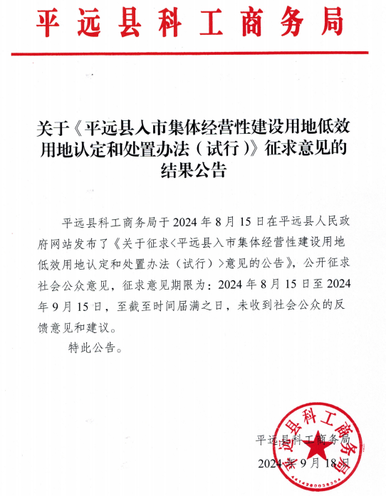 关于《平远县入市集体经营性建设用地低效用地认定和处置办法(试行)》征求意见的结果公告