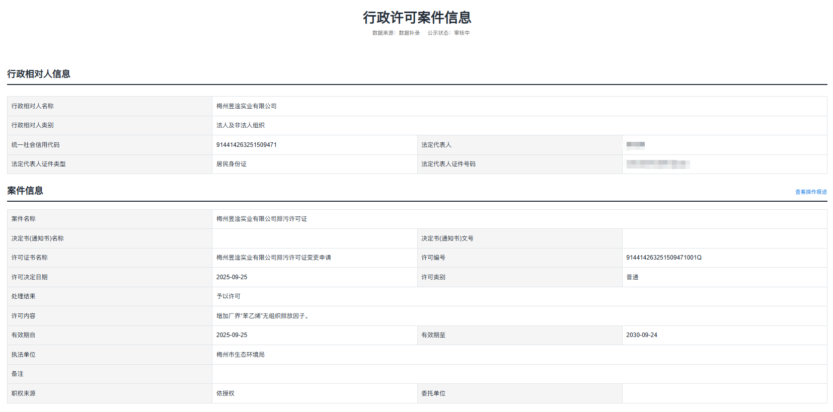 关于梅州昱淦实业有限公司排污许可证变更申请的办结公告