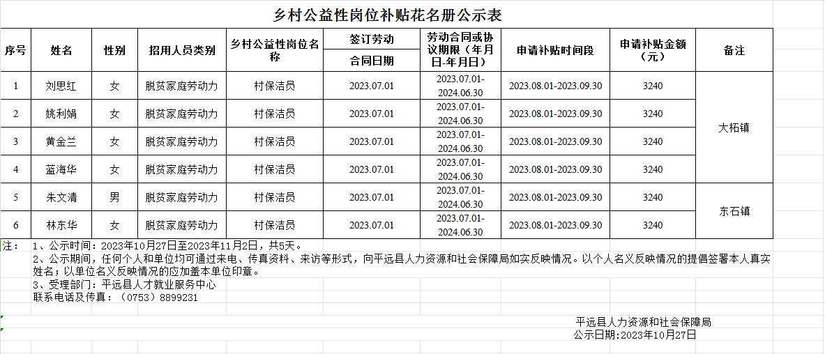 乡村公益性岗位补贴花名册公示表