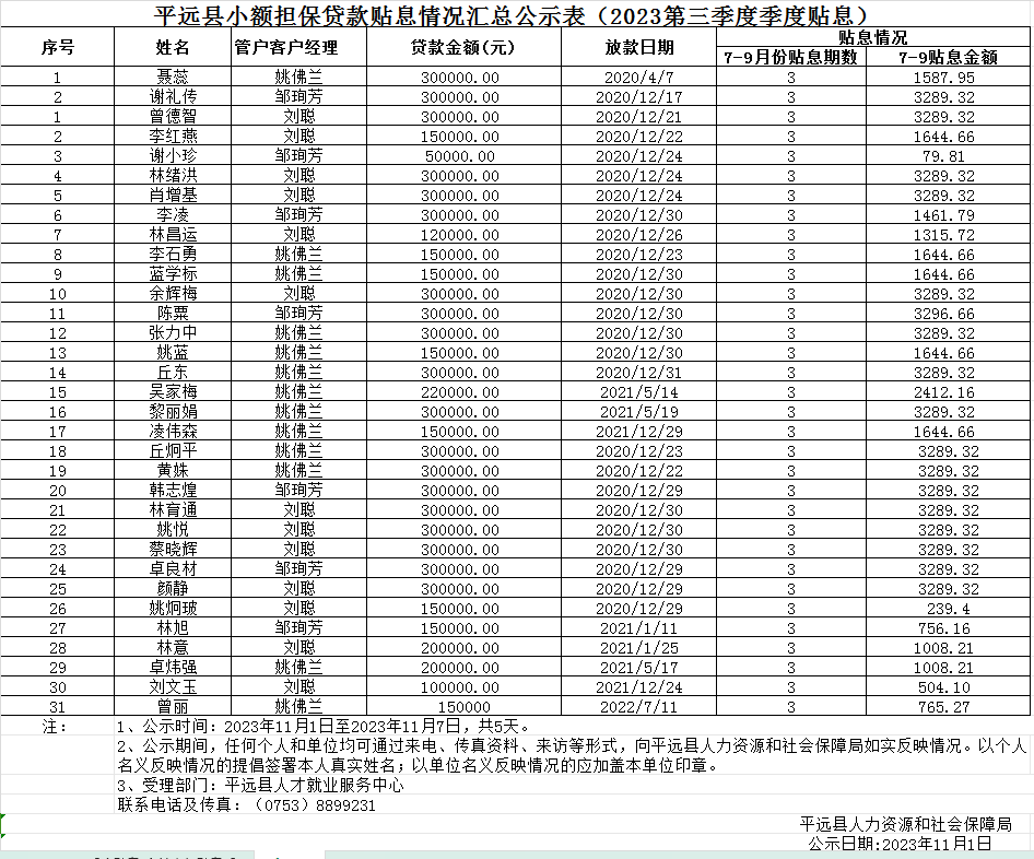平远县小额担保贷款贴息情况汇总公示表(2023第三季度季度贴息)