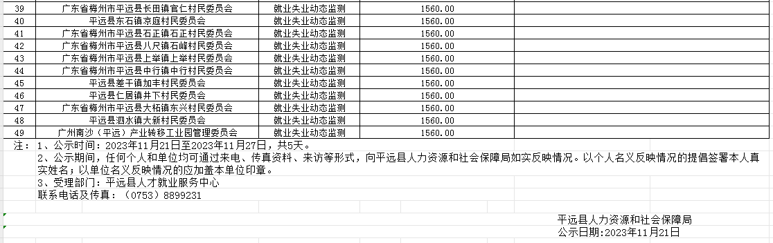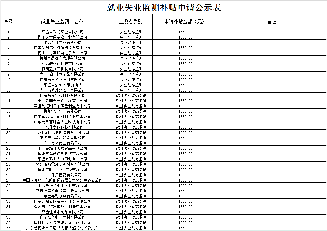 平远县就业失业监测补贴申请公示表