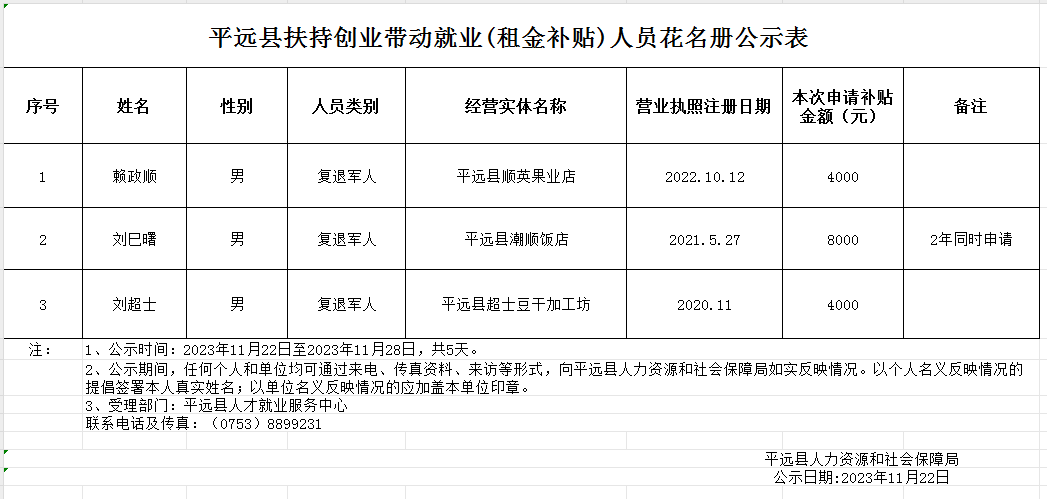 平远县扶持创业带动就业(租金补贴)人员花名册公示表