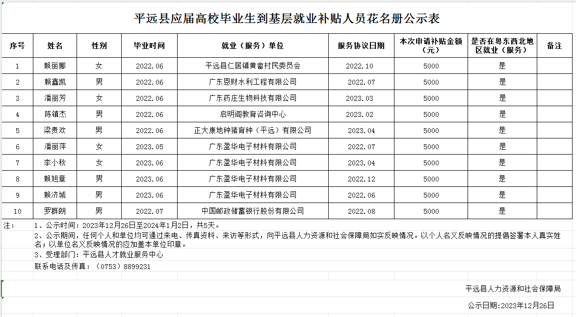 平远县应届高校毕业生到基层就业补贴人员花名册公示表