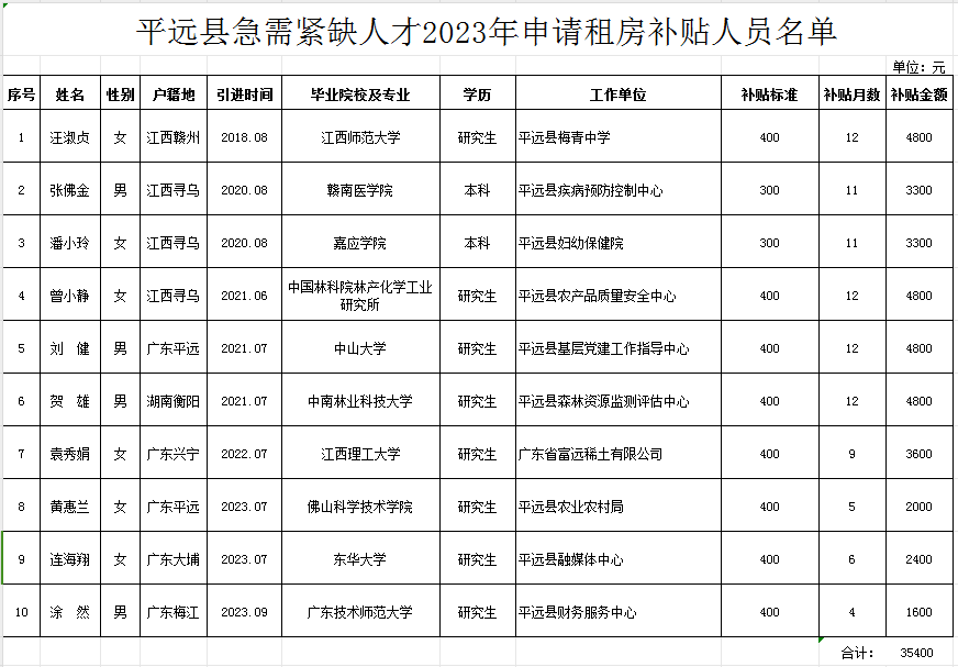 平远县急需紧缺人才2023年申请 租房补贴人员名单公示 根据《平远县人才公寓管理办法(试行)》,经审核,拟同意10位急需紧缺人才申请租房补贴,现予以公示(名单附后)。 公示期间,如对相关人员有异议,请以书面或电话形式向县人力资源和社会保障局反映,反映情况必须使用真实姓名和联系方式,匿名信函或电话不予受理。 公示时间:2024年1月9日至15日(5个工作日) 监督电话:0753-8899317 平远县人力资源和社会保障局 2024年1月8日