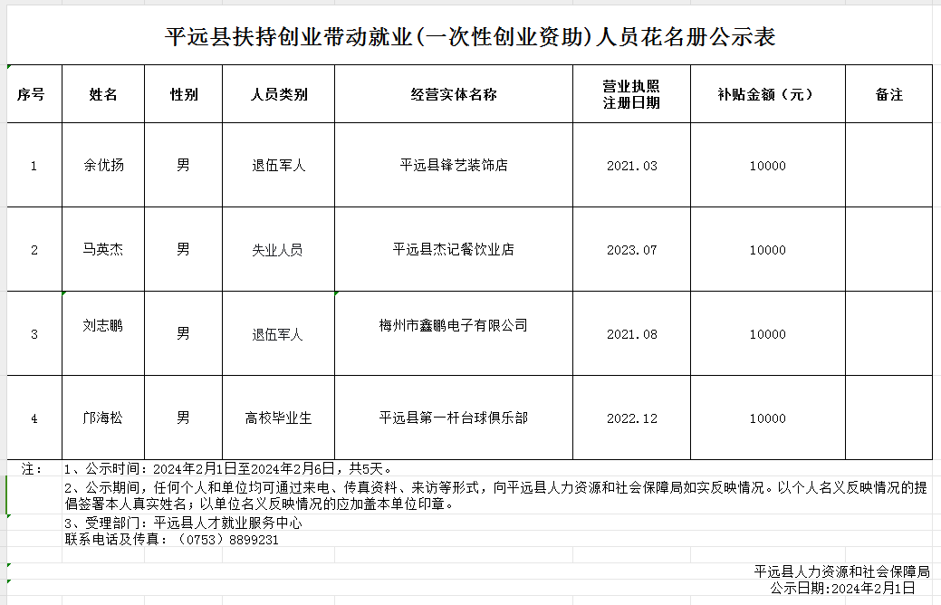 平远县扶持创业带动就业(一次性创业资助)人员花名册公示表