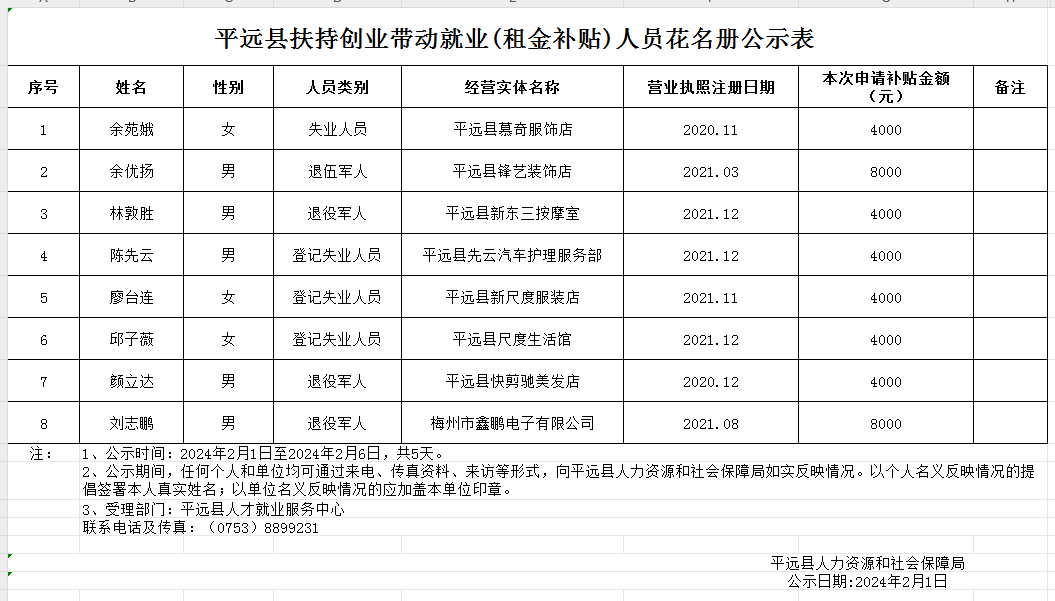 平远县扶持创业带动就业(租金补贴)人员花名册公示表