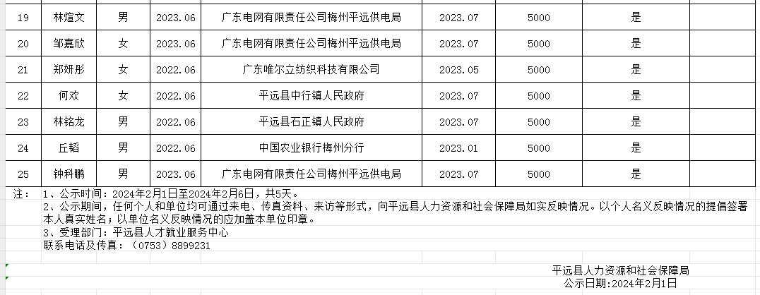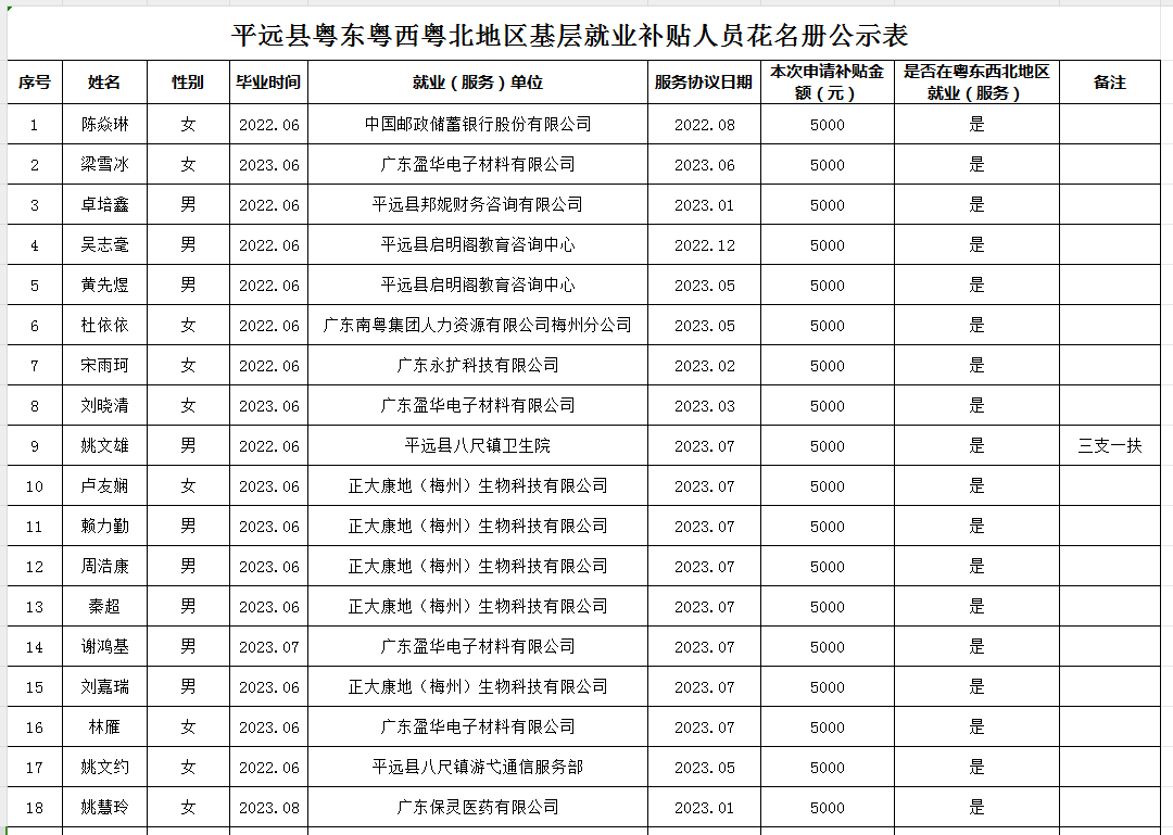 平远县粤东粤西粤北地区基层就业补贴人员花名册公示表
