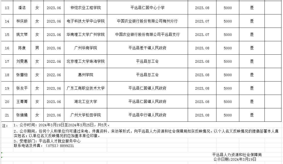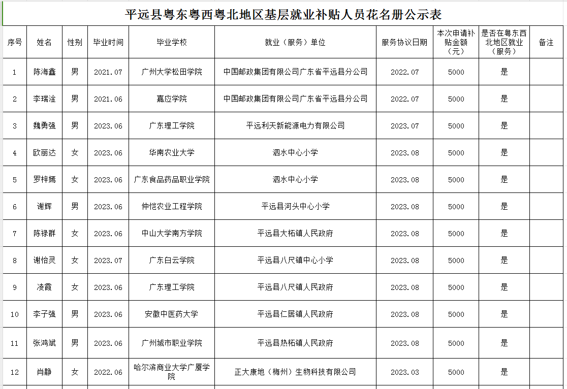 平远县粤东粤西粤北地区基层就业补贴人员花名册公示表