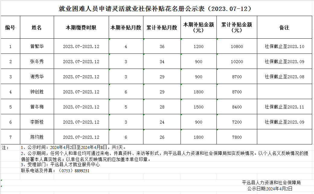 就业困难人员申请灵活就业社保补贴花名册公示表(2023.07-12)