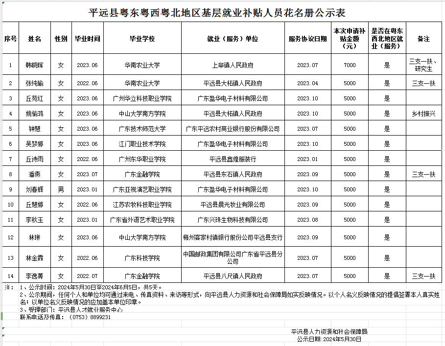 平远县粤东粤西粤北地区基层就业补贴人员花名册公示表