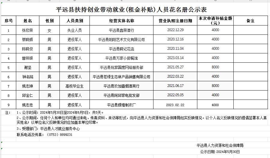 平远县扶持创业带动就业(租金补贴)人员花名册公示表