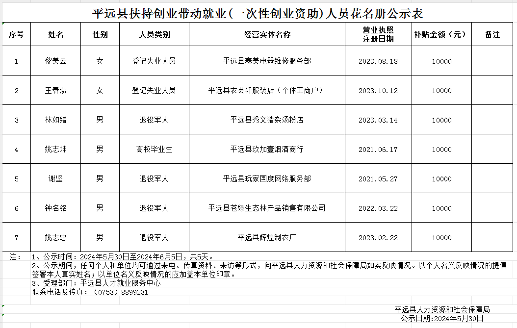 平远县扶持创业带动就业(一次性创业资助)人员花名册公示表