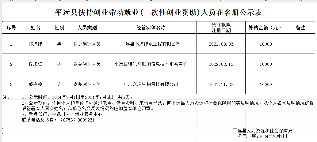 平远县扶持创业带动就业(一次性创业资助)人员花名册公示表