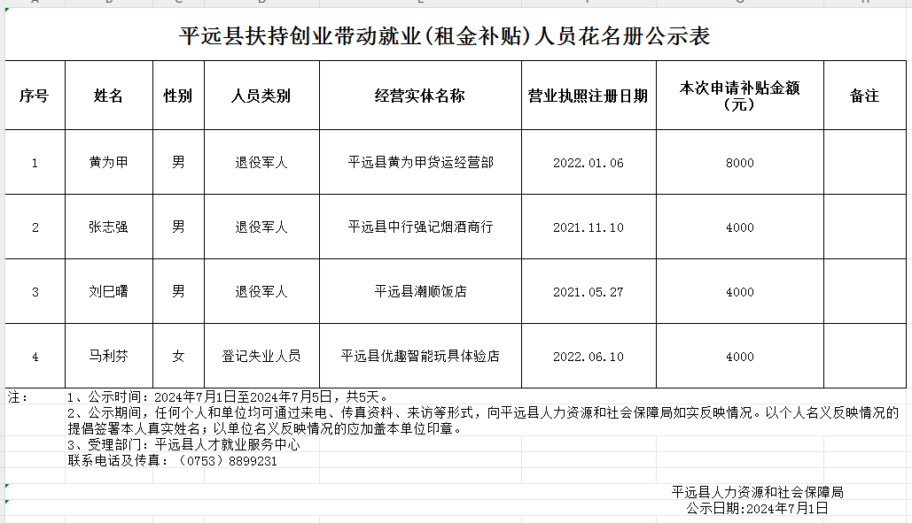 平远县扶持创业带动就业(租金补贴)人员花名册公示表