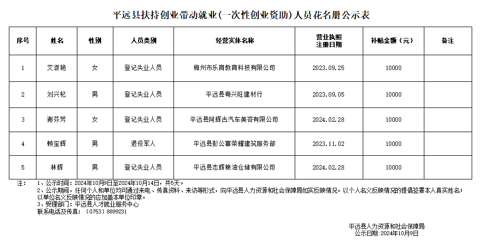 平远县扶持创业带动就业(一次性创业资助)人员花名册公示表