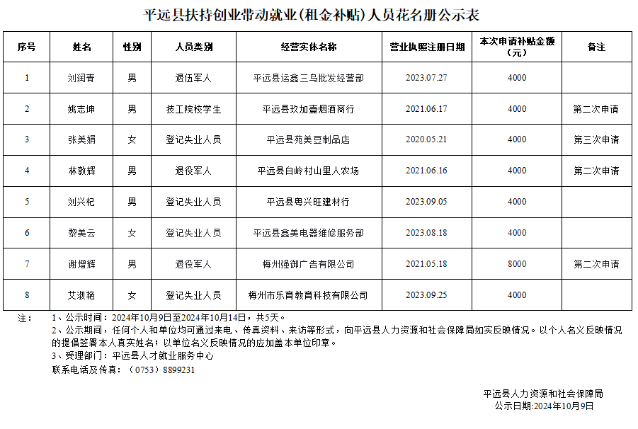 平远县扶持创业带动就业(租金补贴)人员花名册公示表