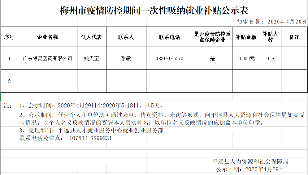 梅州市疫情防控期间一次性吸纳就业补贴公示表