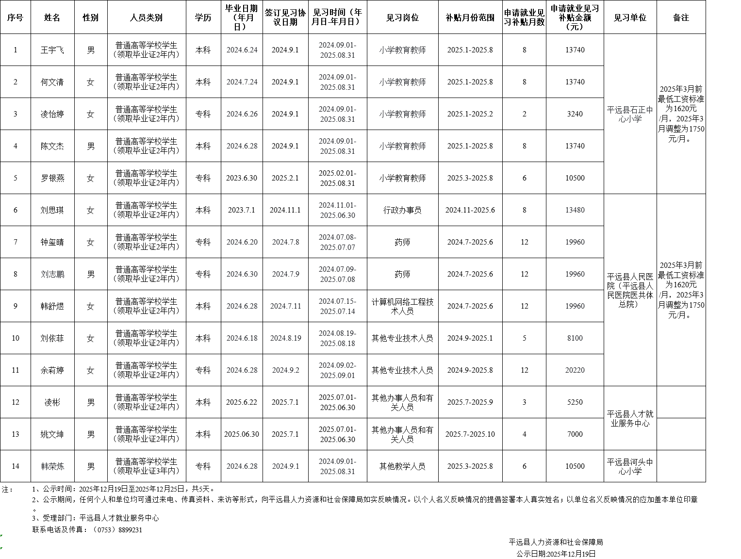 平远县就业见习补贴人员花名册公示表