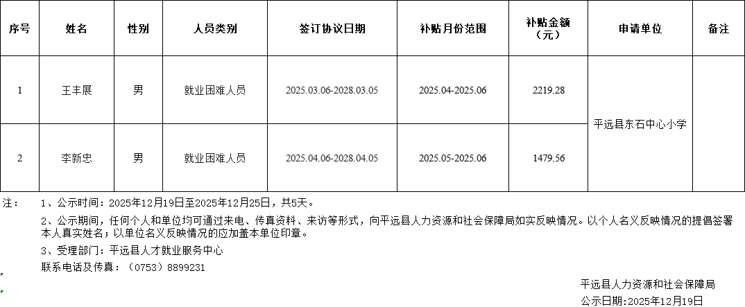 平远县吸纳就业困难人员社保补贴人员花名册公示表