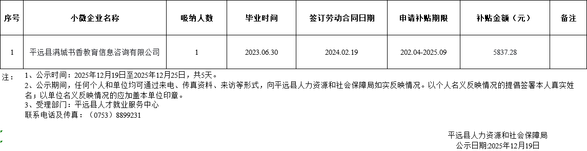 平远县小微企业社保补贴人员花名册公示表